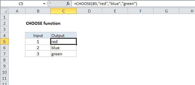 The Excel CHOOSE function returns a value from a list using a given position or index. For example, CHOOSE(2,"red","blue","green") returns "blue", since blue is the 2nd value listed after the index number. The values provided to CHOOSE can include references.