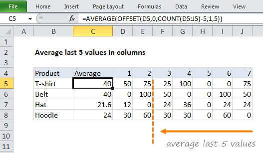 To average the last 5 data points, you can use the AVERAGE function together with the COUNT and OFFSET functions. You can use this approach to average the last N data points: last 3 days, last 6 measurements, etc.