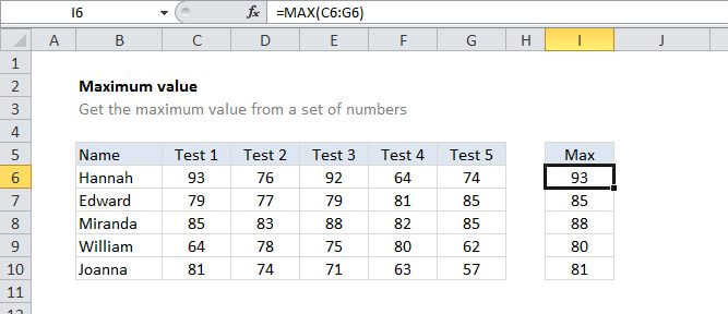 The MAXIFS function, introduced in Excel 2016, is designed to calculate maximums based on one or more criteria without the need for an array formula. With MAXIFS, the formula in I6 is:
