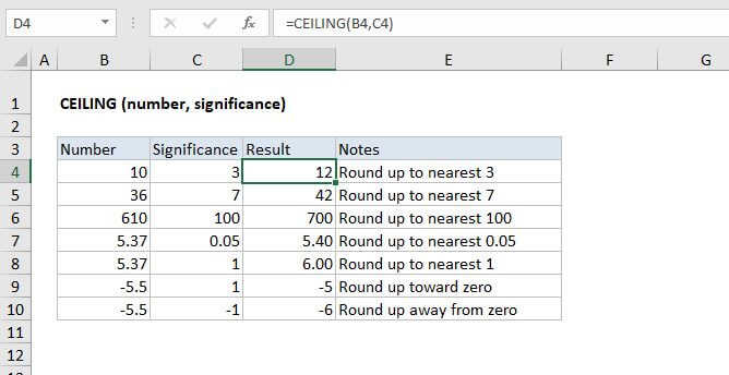 The Excel CEILING function returns a given number rounded up to a specified multiple. For example, =CEILING(A1,5) could be used to round a price in A1 to the nearest 5 dollars. CEILING always rounds up.