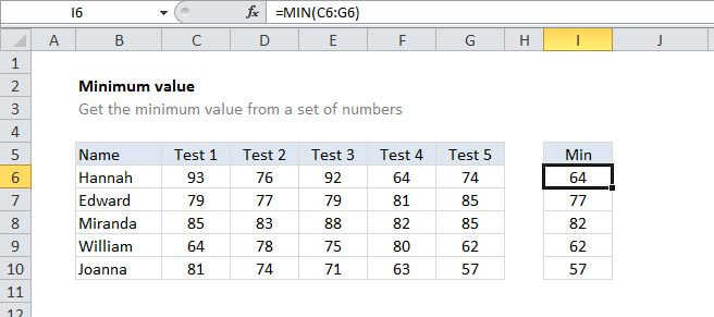 The MINIFS function, introduced in Excel 2016, is designed to return minimums based on one or more criteria, without the need for an array formula. With MINIFS, the formula in I6 becomes: