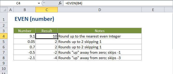 The Excel EVEN function returns the next even integer after rounding a given number up. The EVEN function always rounds numbers up (away from zero) so positive numbers become larger and negative numbers become smaller (i.e. more negative).