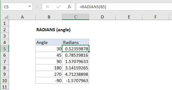 The Excel RADIANS function converts degrees to radians. For example, =RADIANS(360) returns 3.1415 (the value of Pi).