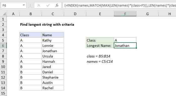 To find the longest string (name, word, etc.) in a column, you can use an array formula based on INDEX and MATCH, together with LEN and MAX. In the example shown, the formula in F6 is: