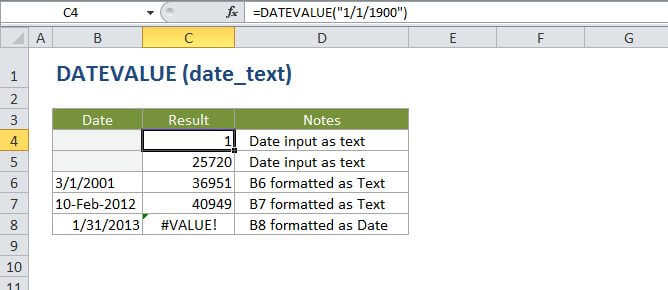 The Excel DATEVALUE function converts a date represented as text into a proper Excel date. For example, the formula =DATEVALUE("12/31/2015") returns a serial number in the Excel date system that represents December 31, 2015. Proper Excel dates are more useful than text dates since they can be directly manipulated with formulas and pivot tables to create summaries and perform other date-based analysis.