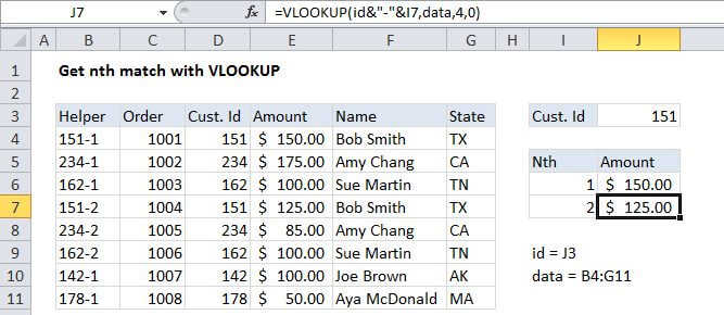 To get the nth match using INDEX and MATCH, you can use an array formula that uses the IF and SMALL functions to figure out the row number of the match.