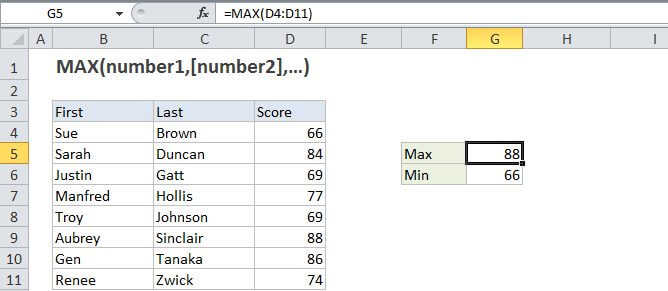 The MAX function can be used to return the largest value from a set of data. For example, the slowest time in a race, the hightest temperature, or the top sales number. Arguments can be provided as constants, or as cell references or ranges, for example:
