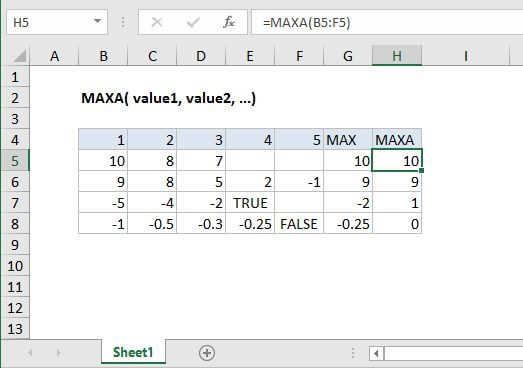 Like the MAX function, the MAXA function returns the largest numeric value in a supplied set of data. For example, the MAXA function can return the highest test score, the slowest time in a race, the maximum temperature, or the top sales number. Arguments can be provided as constants, or as cell references or ranges:
