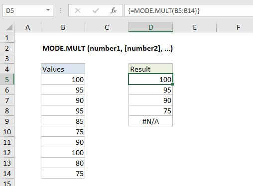 The Excel MODE.MULT function returns a vertical array of the most frequently occurring number(s) in a numeric data set. Numbers can be supplied as numbers, ranges, named ranges, or cell references that contain numeric values. The MODE.MULT function will accept up to 254 inpidual arguments.
