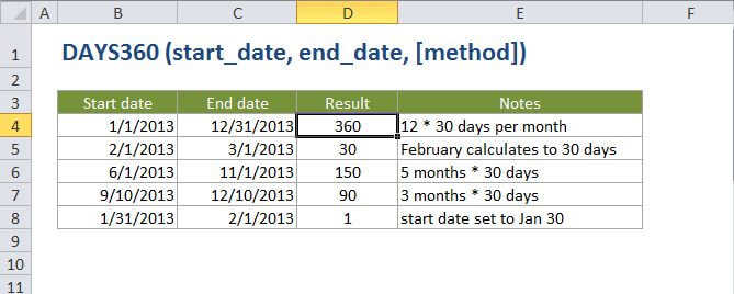 The Excel DAYS360 function returns the number of days between two dates based on a 360-day year. Calculations based on a 360-day year comes from certain accounting calculations where all 12 months are considered to have 30 days.