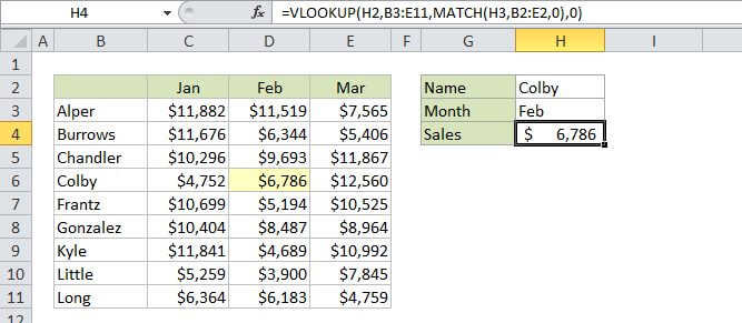 =INDEX(C6:G10,MATCH(J6,B6:B10,1),MATCH(J7,C5:G5,1))