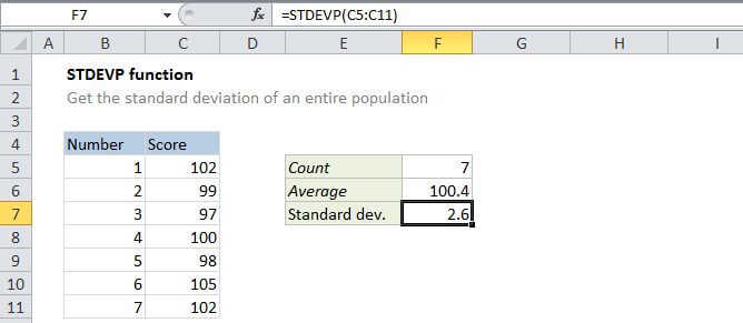 Note: STDEVP has been replaced with a newer function called STDEV.P, which has identical behavior. Although STDEVP still exists for backwards compatibility, Microsoft recommends that people use the newer STDEV.P function instead.