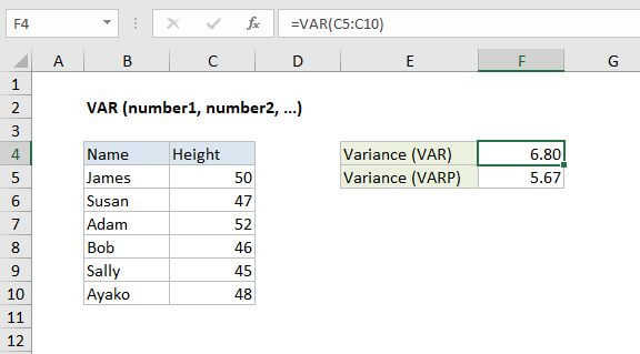 Note: Microsoft classifies VAR as a "compatibility function", now replaced by the VAR.S function.