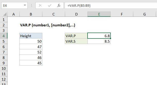 The VAR.P function calculates variance for data that represents an entire population. Variance measures how far a data set is spread out, giving you a general idea of the spread of your data. The VAR.P function can accept up to 254 arguments.