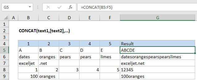 The Excel CONCAT function concatenates (joins) values supplied as references or constants. Unlike the CONCATENATE function (which CONCAT replaces), CONCAT allows you to supply a range of cells to join, in addition to inpidual cell references.