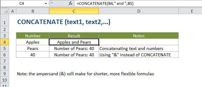 - The ampersand character (&) is an alternative to CONCATENATE. The result is the same, but the ampersand is more flexible, and creates formulas that are shorter and (arguably) easier to read.