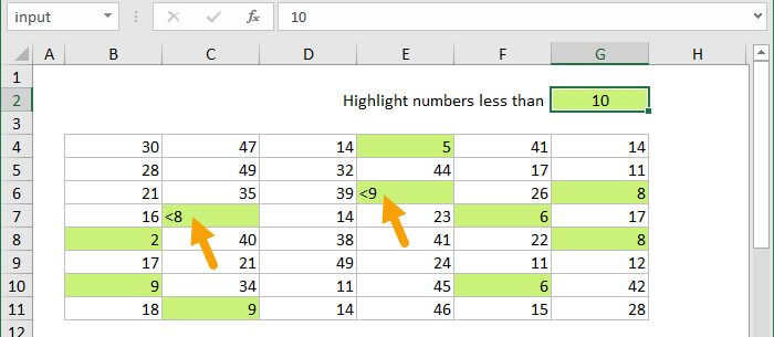 - For each cell in the range B5:B12, the second formula is evaluated. If the value is greater than or equal to 80%, the formula returns TRUE and the yellow fill is applied.