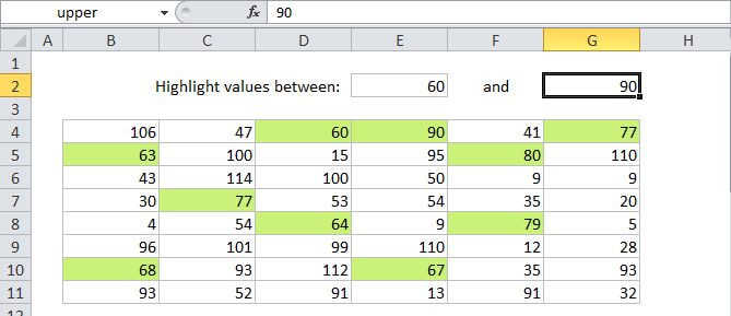 Note: with conditional formatting, it's important that the formula be entered relative to the "active cell" in the selection, which is assumed to be A1 in this case.
