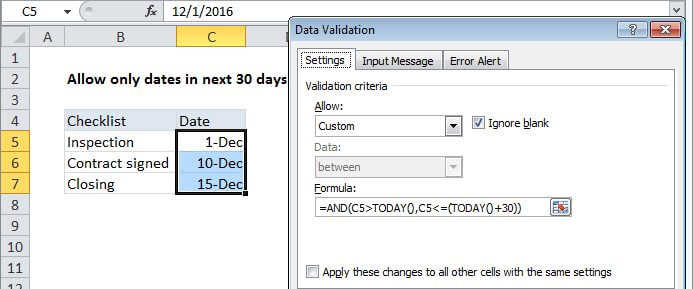 Note: Cell references in data validation formulas are relative to the upper left cell in the range selected when the validation rule is defined, in this case C5.