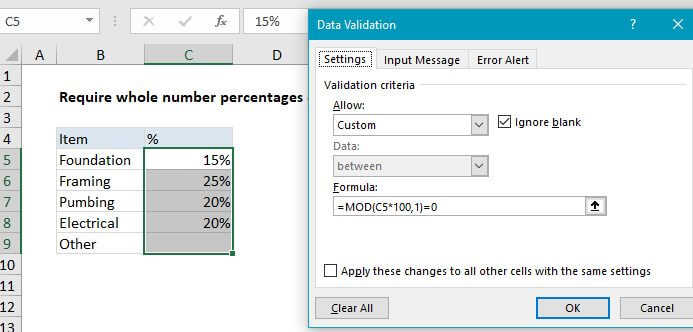 In the example shown, the data validation applied to C5:C9 is: