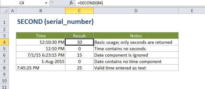 The Excel SECOND function returns the second component of a time as a number between 0-59. For example, with a time of 9:10:15 AM, second will return 15. You can use the SECOND function to extract the second into a cell, or feed the result into another formula, like the TIME function.