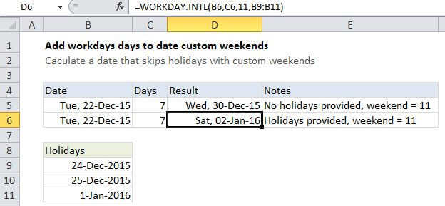 This formula adds 7 workdays days to Tuesday, Dec 22. Three holidays are supplied using the named range "holidays" (B9:B11) and weekends are set using the special syntax "0000000" which means all days in a week are workdays. The result is Thu, December 31, 2015.