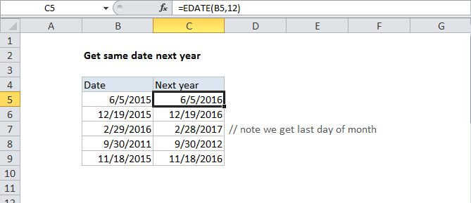 To get the same date next month from a given date, you can use the EDATE function.