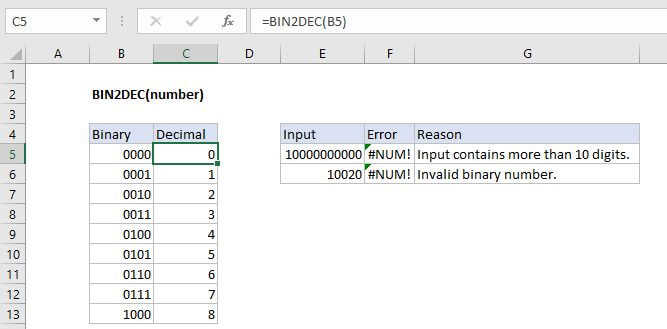 The Excel BIN2DEC function converts a binary number to the decimal equivalent. The input number must contain only zeros and ones and be less than 10 characters long, otherwise the function returns the #NUM! error value.
