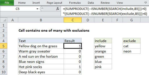 If you want to test a cell to see if it contains one of several things, you can do so with a formula that uses the SEARCH function, with help from the ISNUMBER and SUMPRODUCT functions.