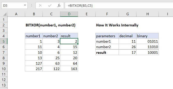 The Excel BITXOR function returns a decimal number representing the bitwise XOR of two numbers. For each corresponding bit in the binary representation of the numbers a logical XOR operation is performed and the resulting number returned.