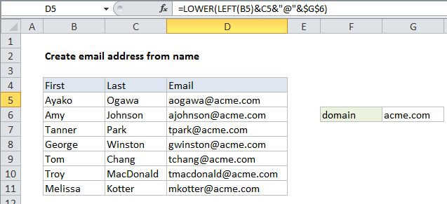 =LOWER(LEFT(C5)&B5)&"@"&"acme.com"