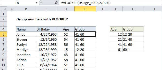 In the example show, we have a list of names and ages and are using the COUNTIFs function to generate a count of ages into 6 brackets. The formula in cell F5 is: