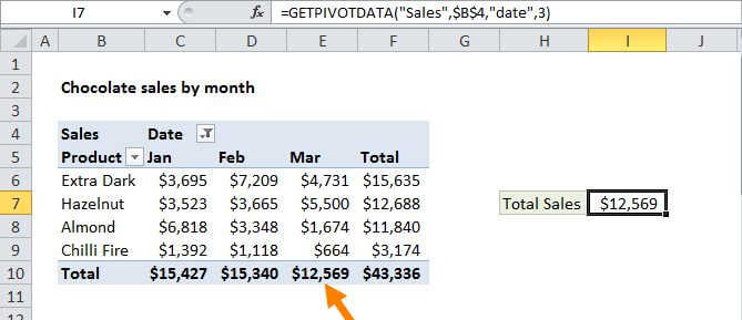 This will give us the grand total. The pivot_table reference can be any cell in the pivot table, but by convention we use the upper left cell.