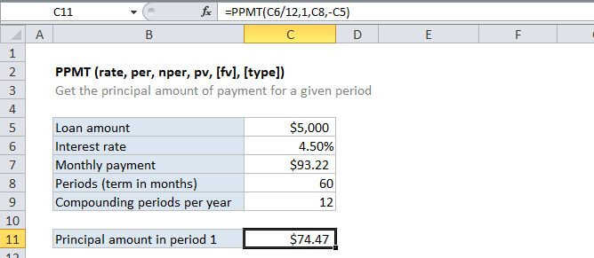 The Excel PPMT function is used to calculate the principal portion of a given loan payment. For example, you can use PPMT to get the principal amount of a payment for the first period, the last period, or any period in between. The period of interest is provided with the per argument, which must be an number between 1 and the total number of payments (nper).
