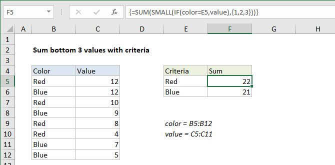 If you need to sum or add the bottom values in a range, you can do so with a formula that uses the SMALL function wrapped inside the SUMPRODUCT function. In the generic form of the formula (above), rng represents a range of cells that contain numeric values and n represents the idea of nth value.
