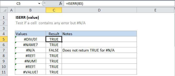 The Excel ISERR function returns TRUE for any error type except the #N/A error. You can use the ISERR function together with the IF function to test for an error and display a custom message, or perform a different calculation if found.