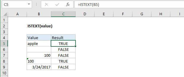 For example, =ISTEXT(A1) will return TRUE if A1 contains "apple".