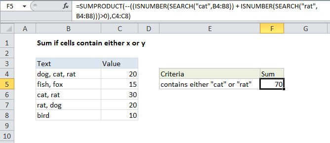 To sum if cells contain both x and y (i.e. contain "cat" and "rat", in the same cell) you can use the SUMIFS function.