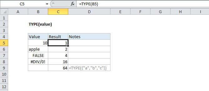 The Excel TYPE function returns a numeric code representing "type" in 5 categories: number = 1, text = 2, logical = 4, error = 16, and array = 64. Use TYPE when the operation of a formula depends on the type of value in a particular cell.