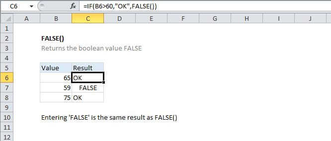 The Excel FALSE function returns the value FALSE. FALSE is classified as a compatibility function, and not needed in most cases. It is equivalent to using the Boolean value FALSE directly in a formula.
