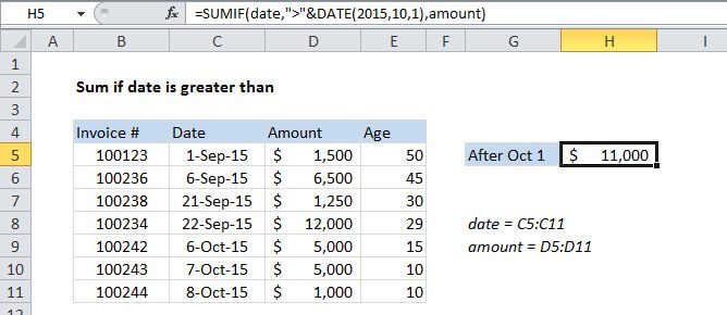 This formula sums the amounts in column D when a date in column C is between a date in H5 and a date in H6. In the example, H5 contains Sept 15, 2015 and H6 contains Oct 15, 2015.